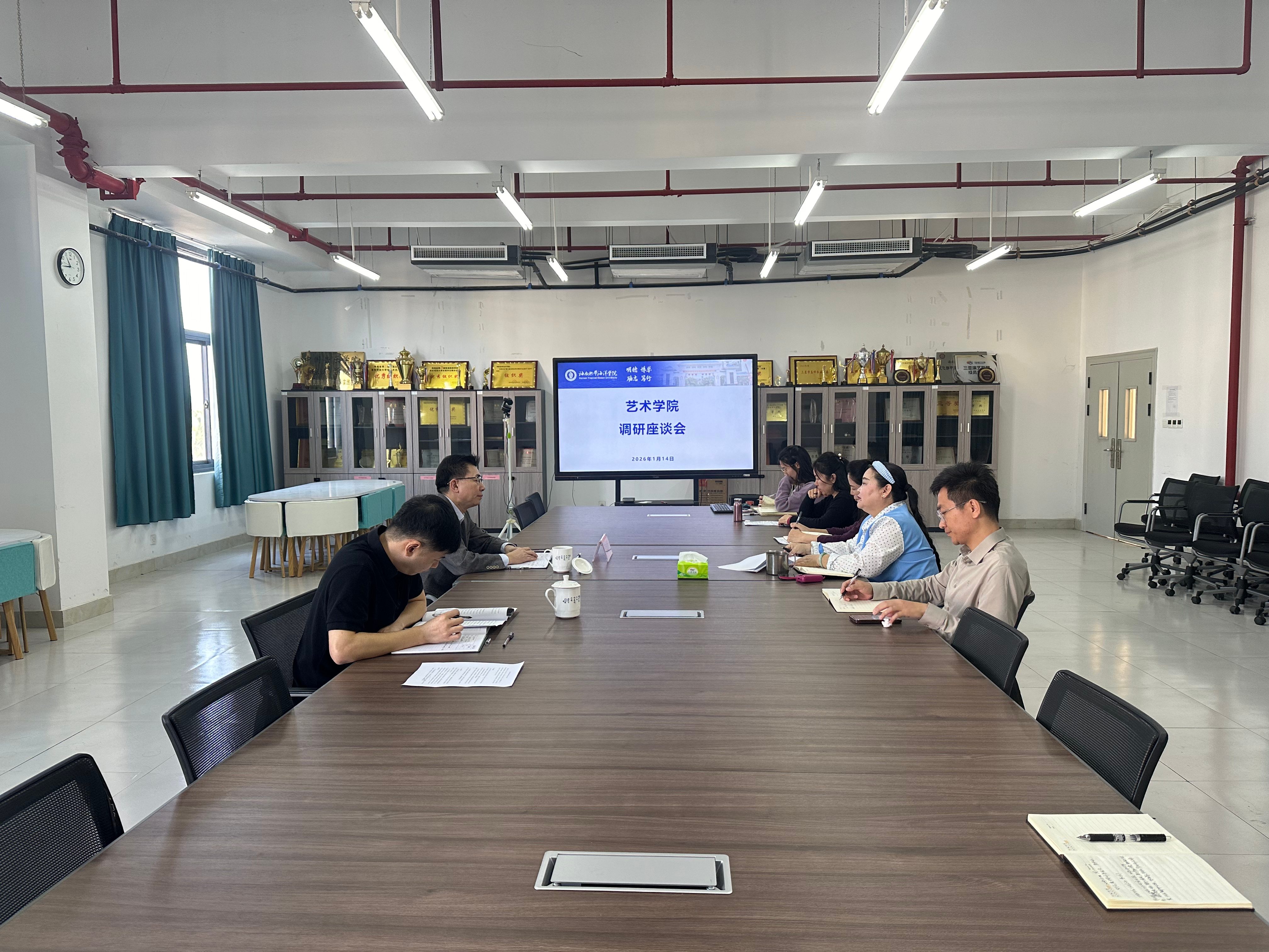 1月14日下午,海南热带海洋学院党委副书记符成彦深入艺术学院开展调研座谈。调研通过听取工作汇报、座谈交流研讨、实地考察走访等形式,全面了解学院党建工作、学科建设、师资队伍、人才培养等核心工作进展,为学院高质量发展精准把脉、指明方向。