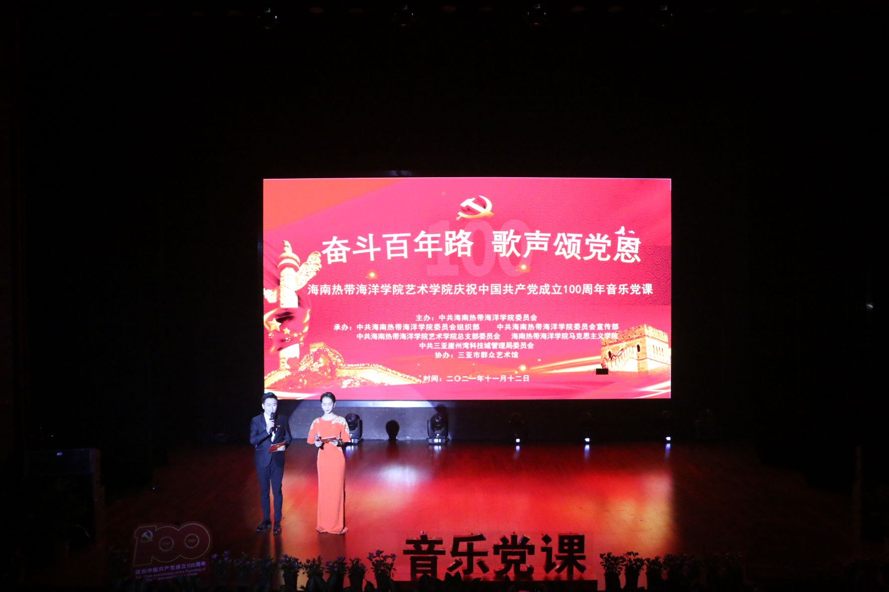 为庆祝中国共产党成立100周年,创新党史学习教育方式,推动党史学习教育深入开展,11月12日晚8点,艺术学院党总支在三亚市群众艺术馆举办音乐党课。