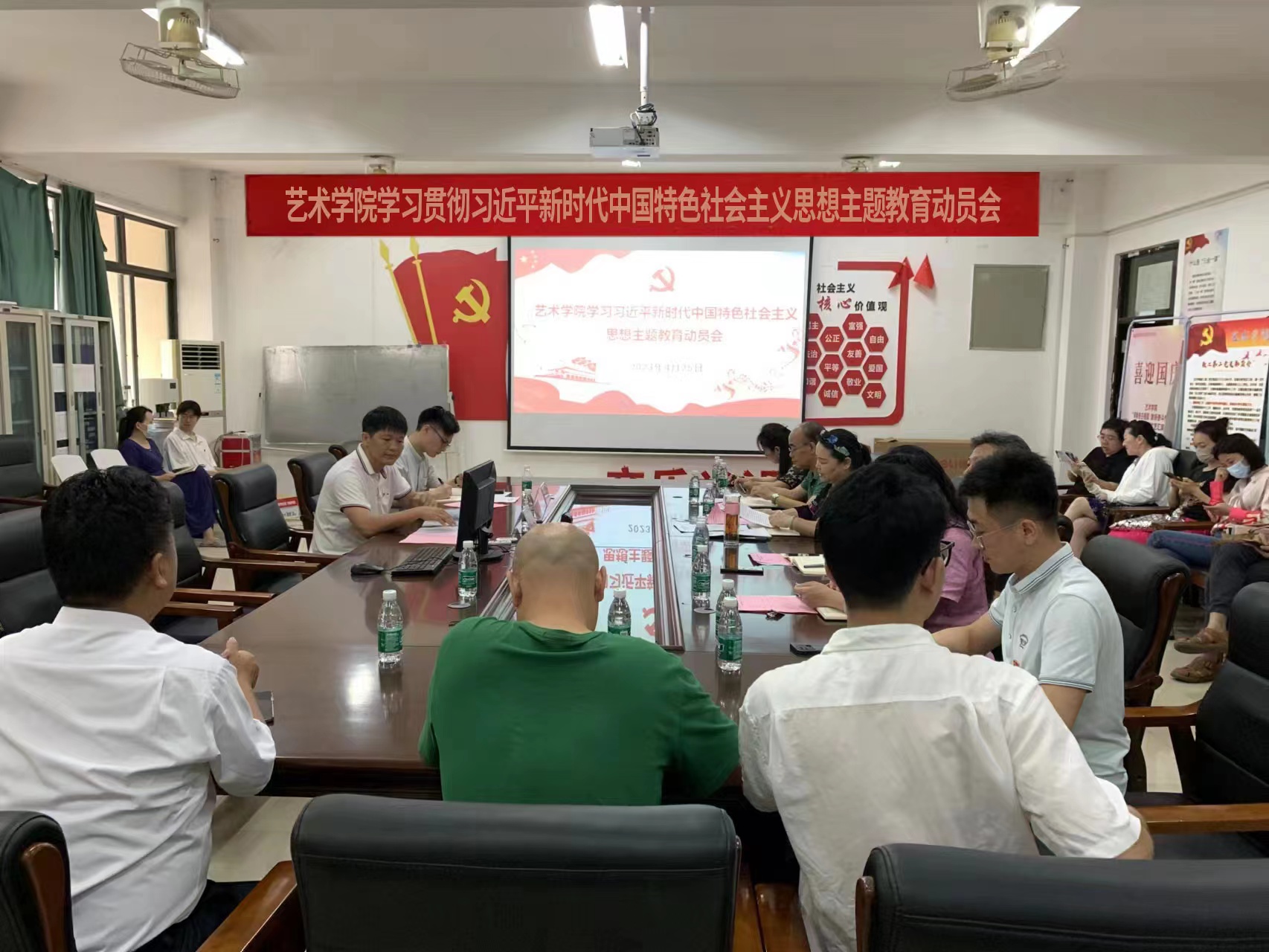2023年4月25日上午,艺术学院在9204会议室开展学习贯彻习近平新时代中国特色社会主义思想主题教育工作会议。会议深入学习贯彻习近平总书记在中央主题教育工作会议上的重要讲话精神,落实省委书记冯飞在全省学习贯彻习近平新时代中国特色社会主义思想主题教育工作会议上的讲话要求,对全校主题教育工作进行动员部署。校主题教育领导小组督查员到会议进行指导。学院党总支书记黄丽华做动员讲话,海南热带海洋学院学习贯彻习近平新时代中国特色社会主义思想主题教育领导小组督导组副组长黄飞做出席讲话。校题教育领导小组督导组副组长黄飞及督导组成员关华、院领导班子成员、各基层党支部书记、各专业负责人、教工党员代表、学生党员代表等参加会议。会议由学院党总支副书记何海滨主持。