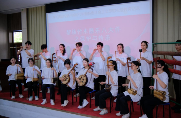 交流会上黄照安先生用其生动幽默的语言讲述了他搜集、挖掘、研究、改良黎族竹木乐器,继承与发展黎族音乐的心路历程,为同学们展示了鼻箫、灼吧、唎咧、口弓、毕哒、㗑、叮咚、独木鼓八件代表性黎族竹木乐器的乐器特色与演奏特点,并使用他本人亲手制作的乐器演奏了《茉莉花》《万泉河水清又清》《鼻箫声声呼唤她》等作品,现场掌声迭起,增进了同学们对黎族乐器浓厚的兴趣。 将民族民间音乐纳入高校专业课程教学体系师艺术学院民族民间传承极其重要的方式,艺术学院音乐专业开设了《黎族竹木器乐演奏》《黎族民歌演唱》《海南民间器乐演奏》等特色课程,其中《海南民歌演唱》《黎族竹木器乐演奏》两门课程分别于2022年、2023年获批海南热带海洋学院校级精品在线开放课程建设立项。