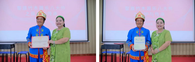 艺术学院党总支黄丽华书记为黄照安先生颁发了外聘专家证书,并赠送我院安亮山教授带领教科研团队编写出版的《海南黎族常用竹木器乐演奏教程》《海南民歌演唱教程》《海南民族民间器乐曲演奏教程》三本系列教材。