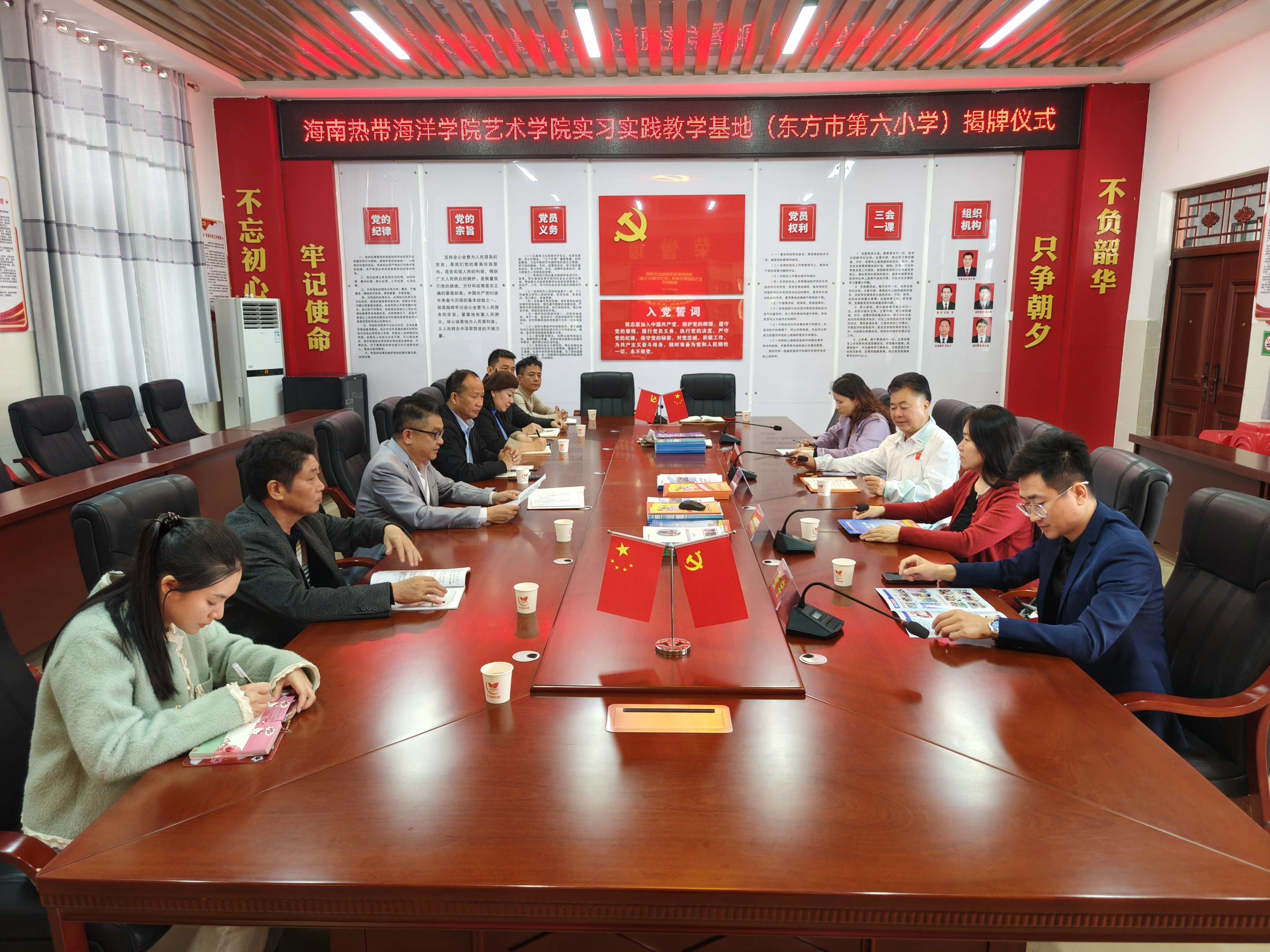 申慧磊副院长对艺术学院情况做了介绍,学院坚持以美育人、 以美化人的教育理念,此次与东方市第六小学共建实习实践教学基地,不仅为学院学生提供了将理论知识与艺术实践相结合的宝贵平台,也期望能充分发挥专业特长,为六小的同学们播撒艺术的种子,实现校地双方资源共享、优势互补、互利共赢的良好局面。随后与会的各位老师就具体合作事宜进行了深入交流。
