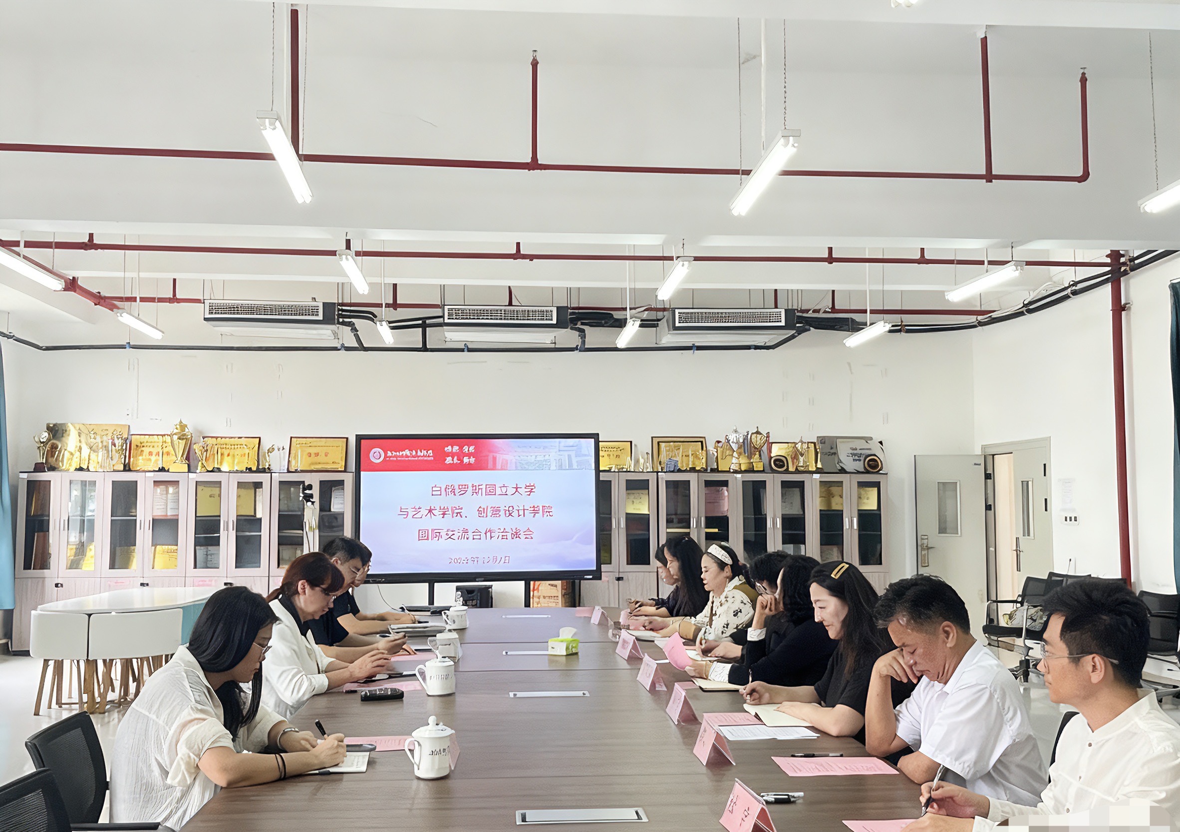 2025年12月2日下午,我校艺术学院、创意设计学院与白俄罗斯国立大学相关负责人在艺术楼301会议室召开国际交流合作洽谈会。白俄罗斯国立大学中国创新教育研究院执行院长杨森、教学副院长娜塔莉亚·弗拉基米洛夫娜、招生合作办公室主任于亚平,我校国际交流与合作处副处长郭乐庭出席会议,艺术学院、创意设计学院领导及相关部门负责人参会,会议由艺术学院副院长郑红主持。