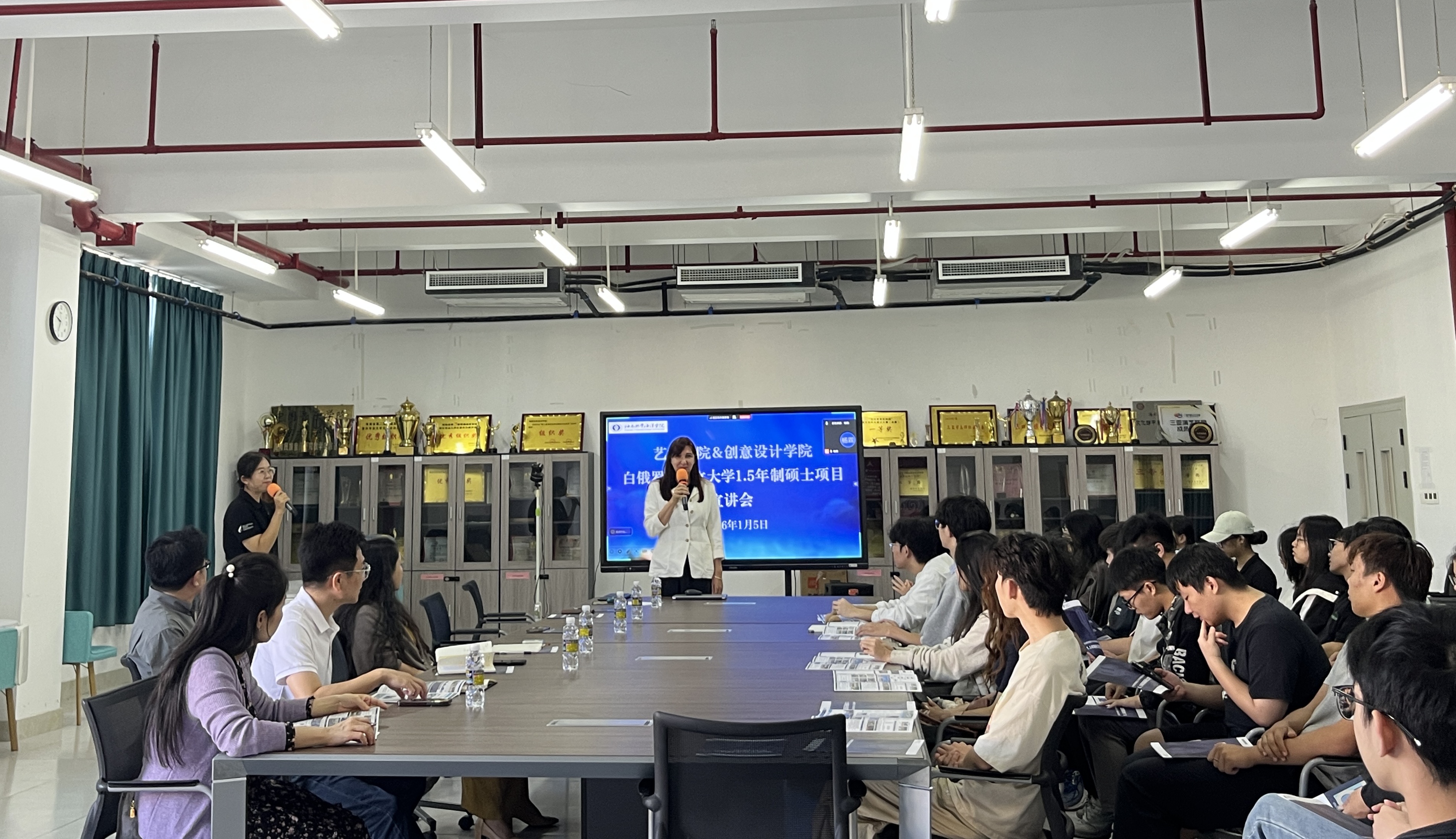 娜塔莉亚·弗拉基米洛夫娜首先感谢艺术学院、创意设计学院对合作办学项目付出的努力,介绍了在中白两国友好邦交背景下,白俄罗斯国立大学中国创新教育研究院与我校缔结为友好学校,交流合作的整体情况。于亚平主任结合院校特色与艺术专业优势展开详细讲解,介绍了白俄罗斯国立大学整体概况,重点解读了艺术学、教育学硕士1.5年制项目的特色亮点和优势,本硕衔接,融合培养,硕士师资团队汇聚白俄罗斯及欧洲当代艺术领域知名专家,定期开展国际学术交流活动,为留学生提供舒适生活环境,当地生活成本适中,整体费用性价比突出。同时解读2026年春季招生情况,明确申请流程、材料准备要点及毕业要求,着重介绍了学校在助力学生提升就业竞争力方面的举措。