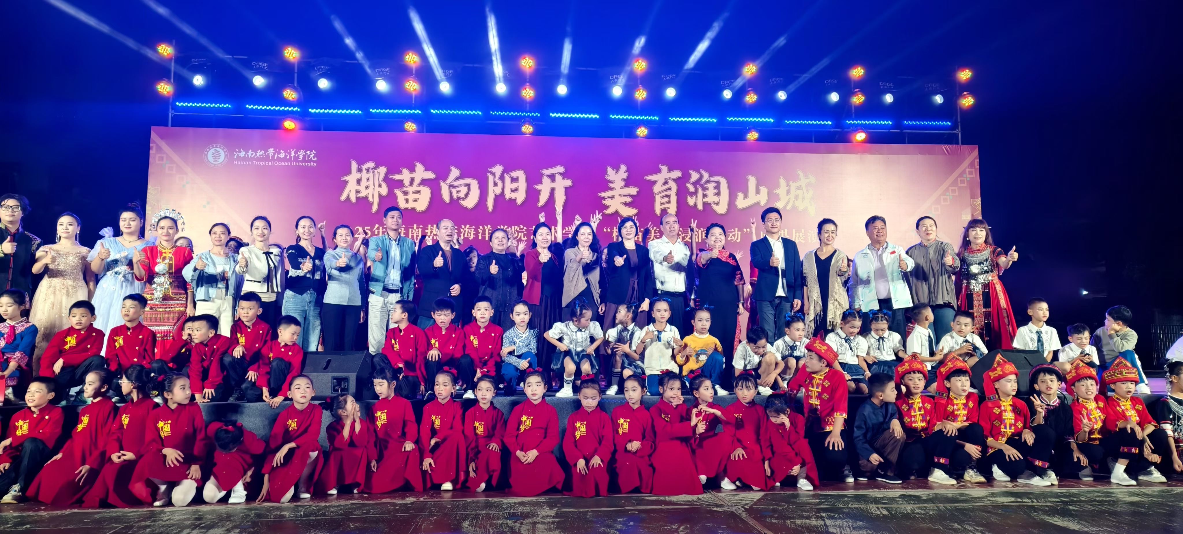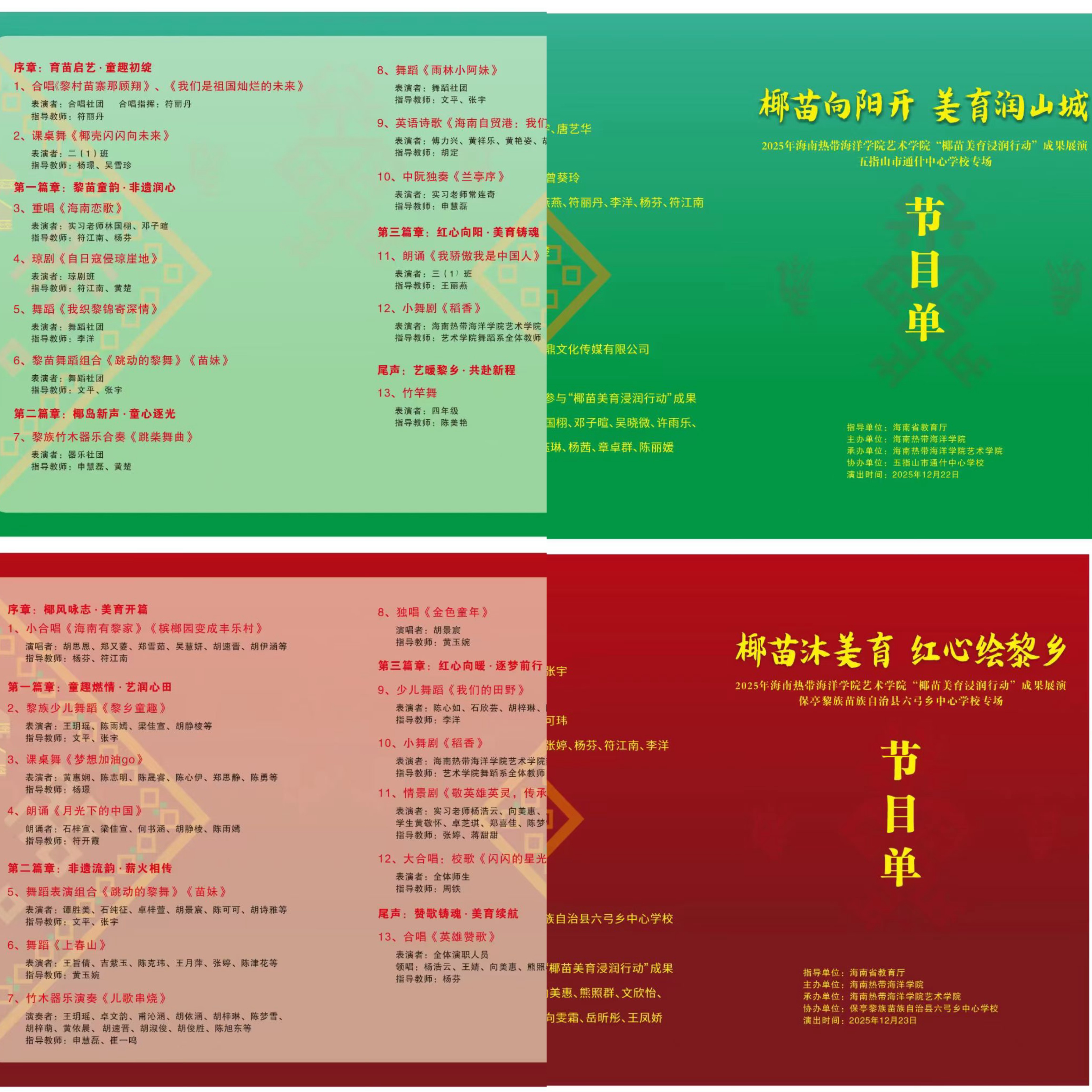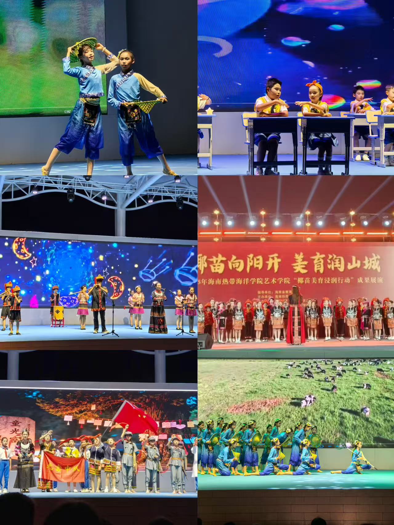 2025年12月22日至23日,作为海南省教育厅“椰苗美育浸润行动”第二批帮扶高校,海南热带海洋学院艺术学院分别在五指山市通什中心学校、保亭黎族苗族自治县六弓乡中心学校,成功举办“椰苗向阳开 美育润山城”和“椰苗沐美育 红心绘黎乡”两场主题成果展演。艺术学院领导班子、椰苗美育工作小组全体师生出席两场展演活动,还特别邀请属地教育局、校领导及乡镇领导莅临现场观摩指导。学院椰苗美育工作小组深度参与活动策划与演出执行等核心环节,展演内容丰富、形式新颖,赢得现场观众与社会各界的高度赞誉。