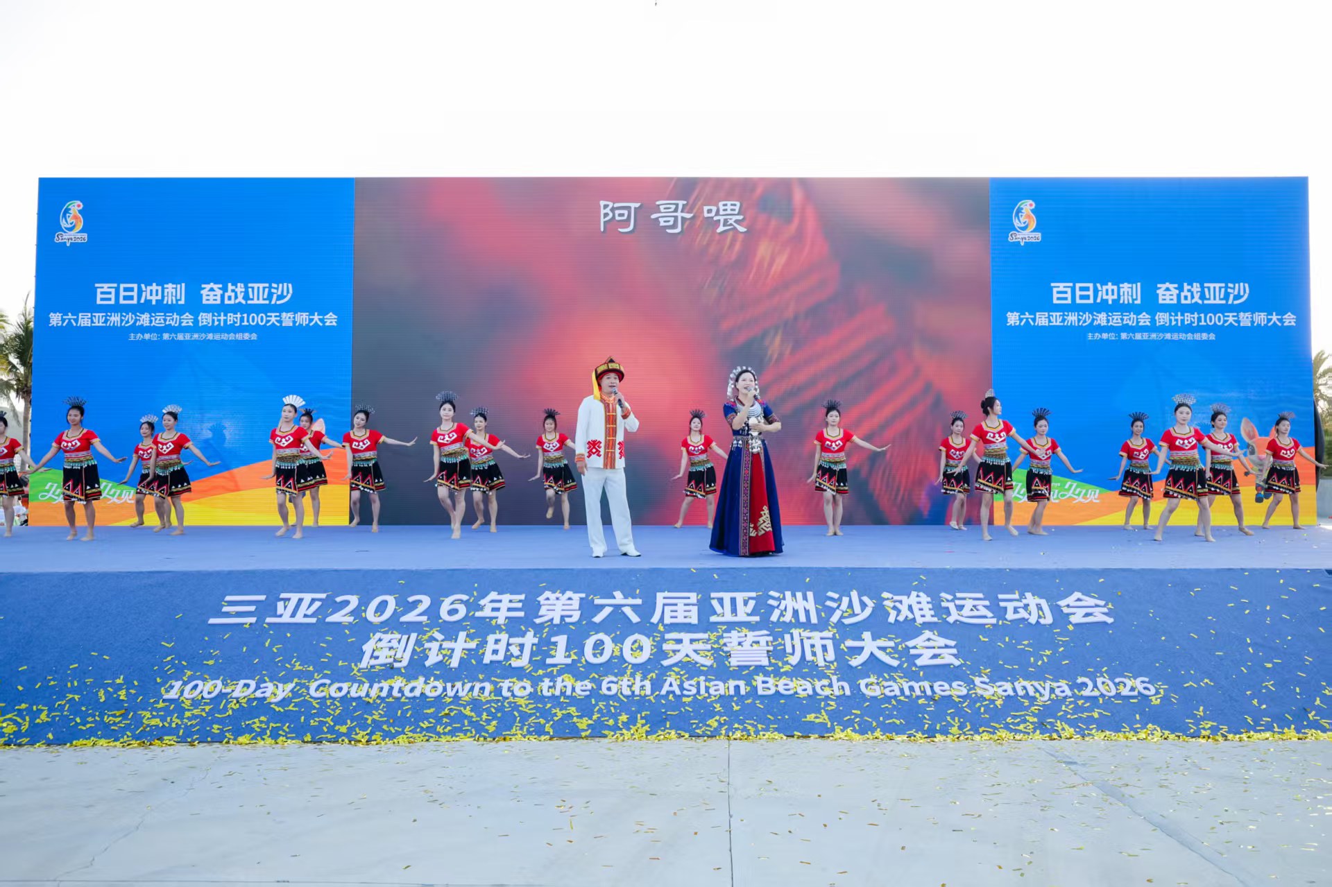 大型歌舞《天涯为家》:以乐为媒,唱响天涯情缘。作为亚沙会宣传推广歌曲,《天涯为家》以“心有天涯,天涯即为家”为核心立意,融入落笔洞、鹿回头等三亚地域文化符号与“人类命运共同体”理念,副歌嵌入英文口号“See ya in Sanya”,间奏穿插海南方言版《久久不见久久见》合唱,兼具文化底蕴与国际视野,将海南人民喜迎八方宾朋的开放胸怀展现得淋漓尽致,为誓师大会拉开完美序幕。大型情景舞蹈《蓝色的邀请》:以舞传情,绘就滨海盛景。深度融合亚洲各国风情与海南民族特色,以“蓝色海洋”为视觉主线,舞者的灵动舞姿仿佛海浪奔涌、椰影摇曳。节目通过沉浸式表达,将沙滩运动的活力与热带海岛的浪漫融为一体,既呼应了亚沙会“时尚、绿色、科技、活力”的办赛理念,更以艺术语言向亚洲健儿发出诚挚邀约,传递出“天涯海角共赴约”的美好期许。歌曲联唱:经典新编,点燃全场热情。歌手们身着黎族传统服饰登台,将《亚洲雄风》的激昂豪迈、《久久不见久久见》的温婉深情与《请到天涯海角来》的轻快灵动完美串联,既展现了海南本土文化的独特魅力,又传递出亚洲各国人民相知相伴的深厚情谊,歌声激荡着对盛会的期待与自信,赢得全场共鸣。
