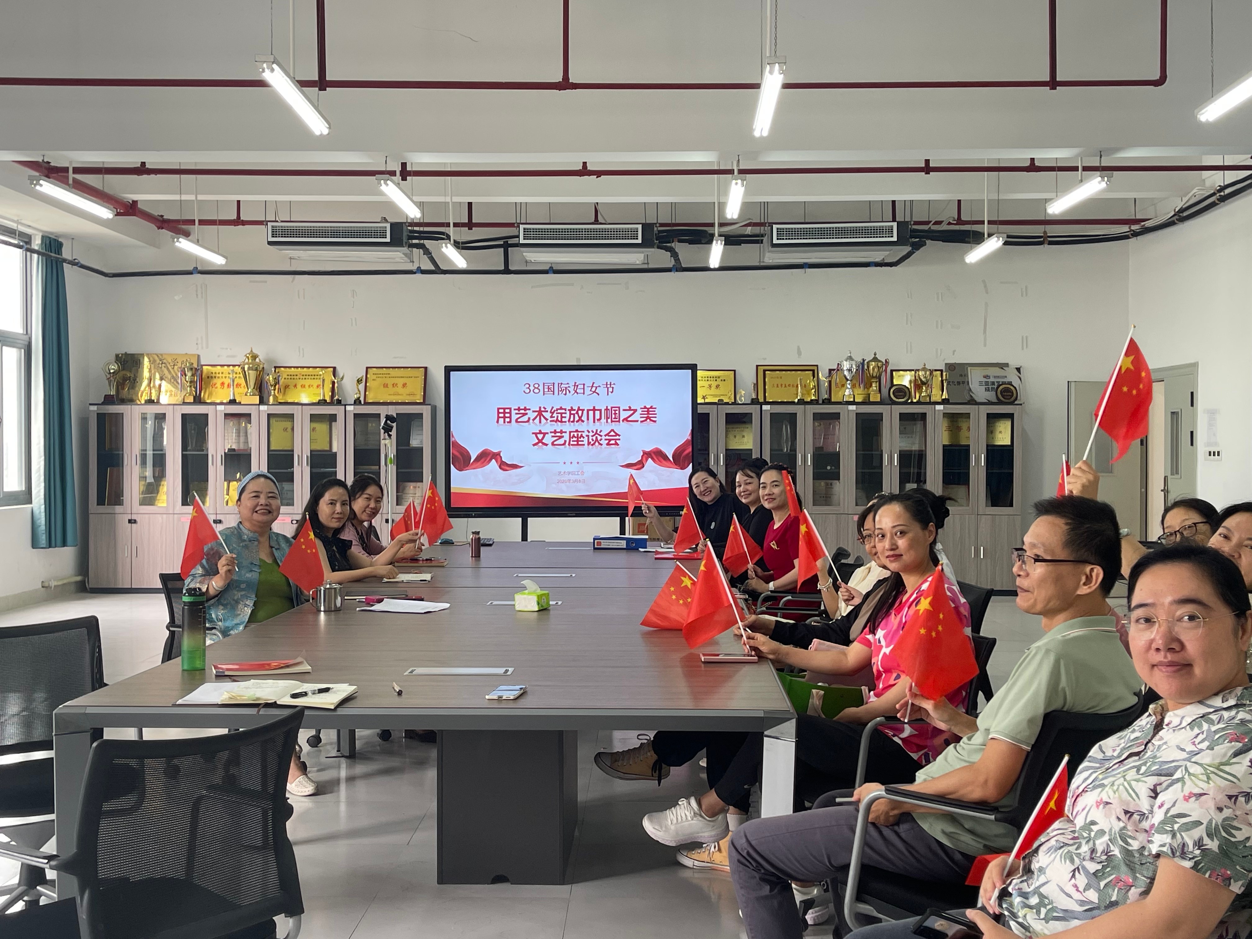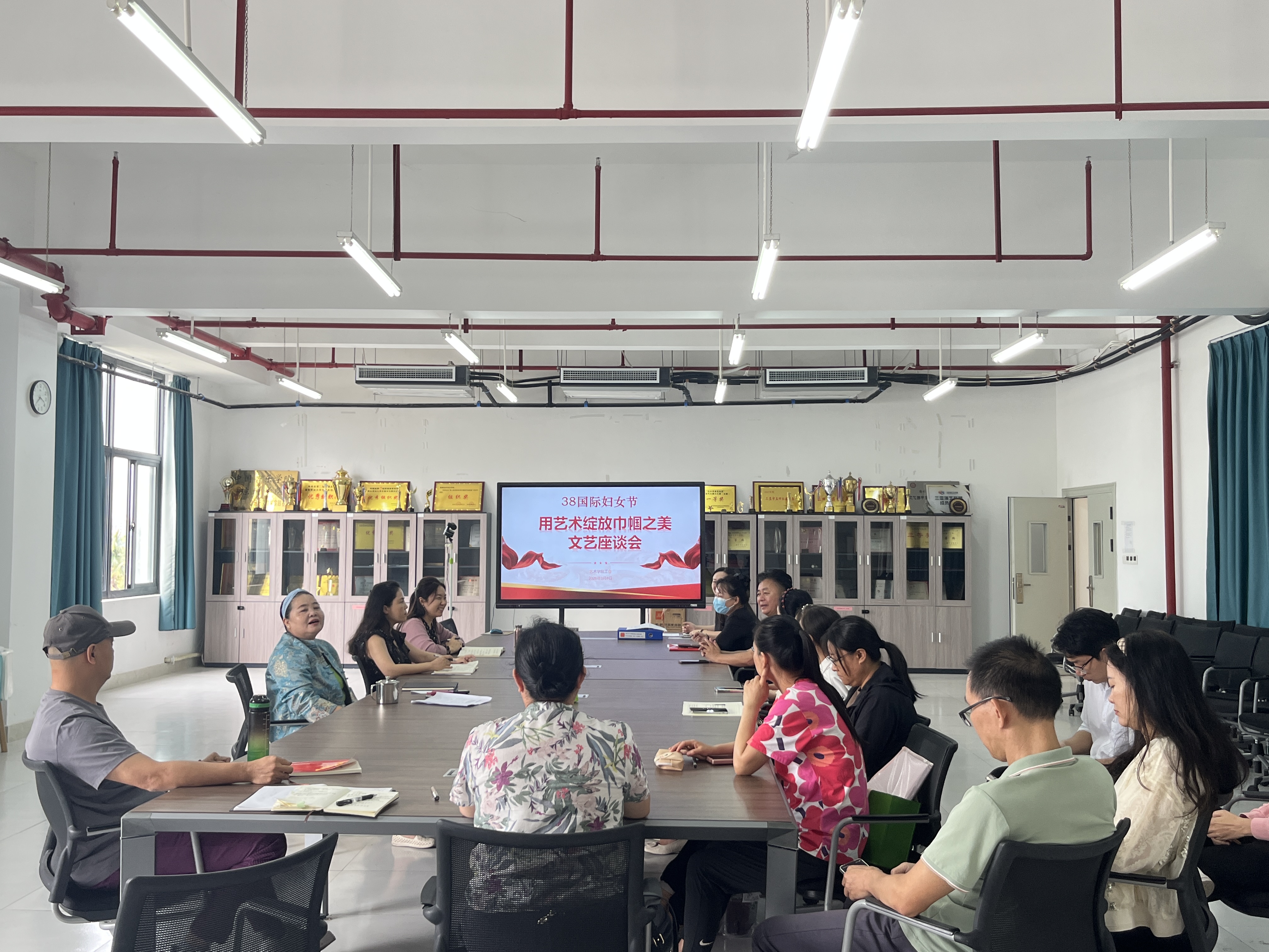 3月8日上午10点,艺术学院在301会议室召开“用艺术绽放巾帼之美”文艺座谈会。学院党总支书记黄丽华、副院长郑红、副书记张宇、副院长申慧磊出席会议,全体女教职工齐聚一堂,共庆佳节。会议由党总支书记黄丽华主持。