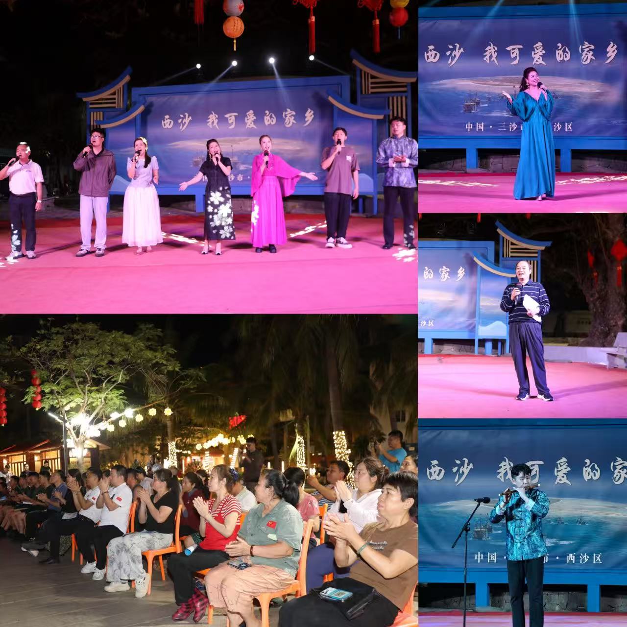 公益演出在三沙市三沙社区大舞台上演,海南省音乐家协会理事韩沙霖,会员崔一鸣、石园园等艺术家轮番献艺。《军营飞来一只百灵》《大海故乡》等歌曲灵动、抒情动人,《祖国,我为你干杯》《春风十万里》激昂振奋,《踏浪》《请到天涯海角来》节奏明快、亲切感人,笛子独奏《扬鞭催马运粮忙》点燃全场氛围。值得一提的是,海南热带海洋学院银龄专家肖武雄教授更是为这次西沙之行作词谱曲,创作了歌颂人民子弟兵保家卫国的声乐作品《军民同心护海疆》,歌曲深受欢迎,观众纷纷学唱,并共同见证肖武雄教授赠予三沙市三沙区委区政府原创作品手稿和合成音频,为历史存真,为演出增彩。